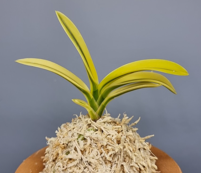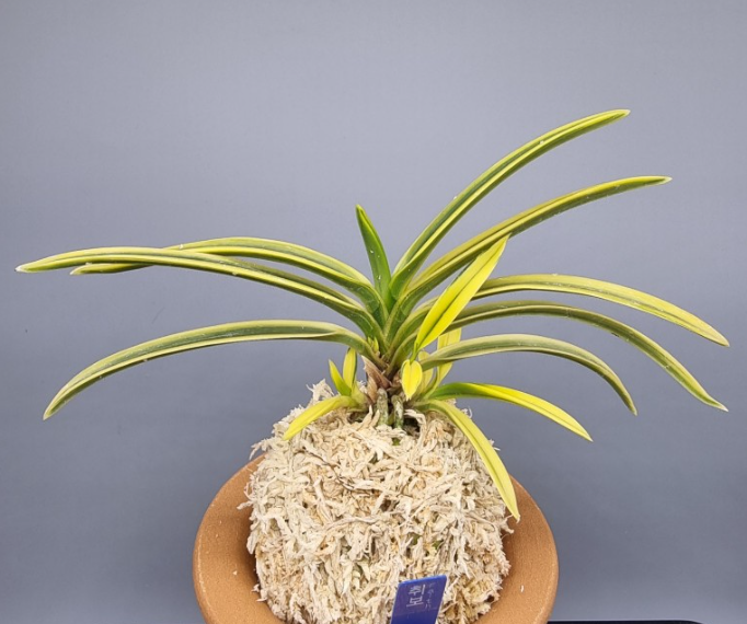 It is a large paper with perfect volume. The wide and thick leaves grow in a lobular form at first, but later become whitish. The origin is the Amami region, and there is an anecdote that when a senior farmer, now deceased, first encountered this orchid, he grew it from an extremely flat pattern to the current perfect double ring. When young leaves emerge, they appear plain, but soon turn yellow from the tips of the leaves. The pattern type is the luxury [full moon] type. Until now, many of the Daebokryun breeds have had very flashy new growth patterns, or have rounded spots, or are wild, but this species is said to have very good pattern stability. The axis is a red-colored knee muscle with a small number of teeth, and the attachment is basically a moon shape.